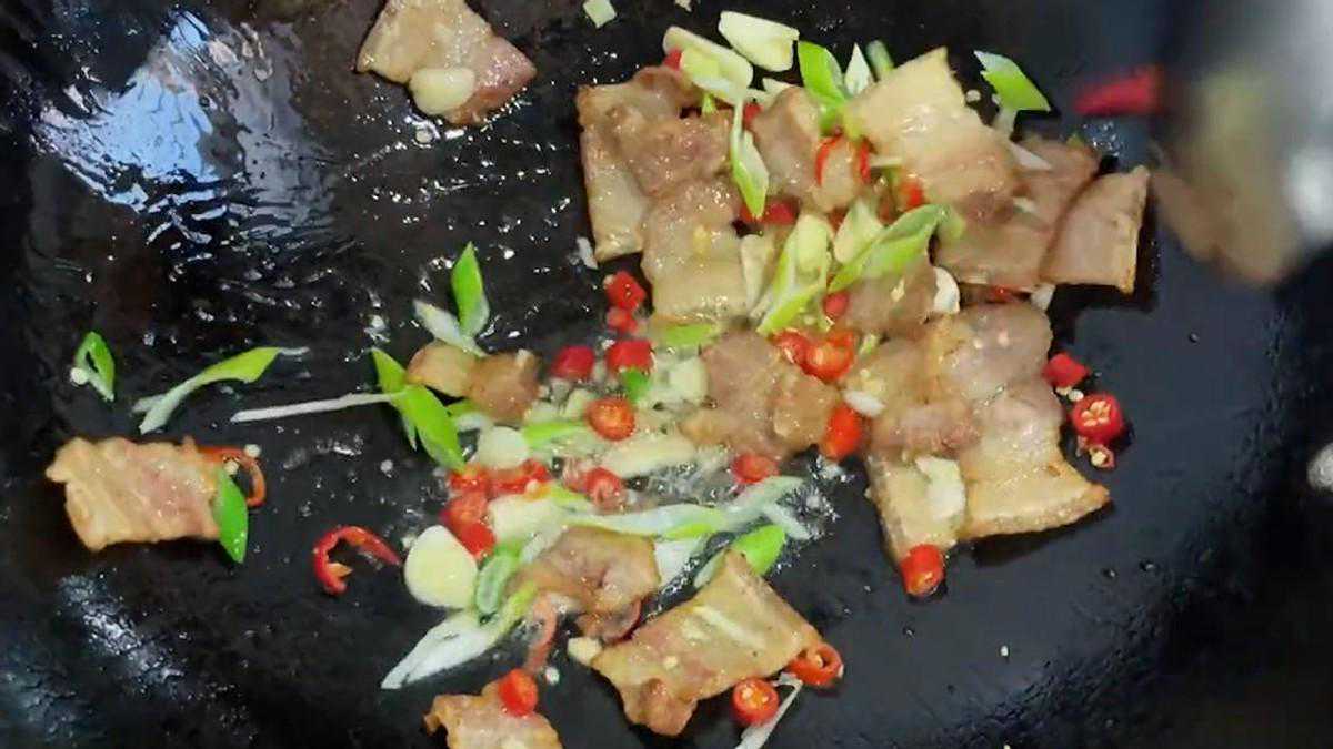 再来切点肉片,切好放入盘中,起锅烧油,油热下入五花肉,把五花肉下锅炒一下,五花肉要多炒一会,把里边的油脂炒出来,把五花肉炒成金黄色,把里边的多余的油盛出来。