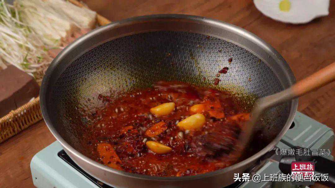 先来炒个底料,姜蒜爆香,然后下火锅底料和豆瓣酱炒出红油~