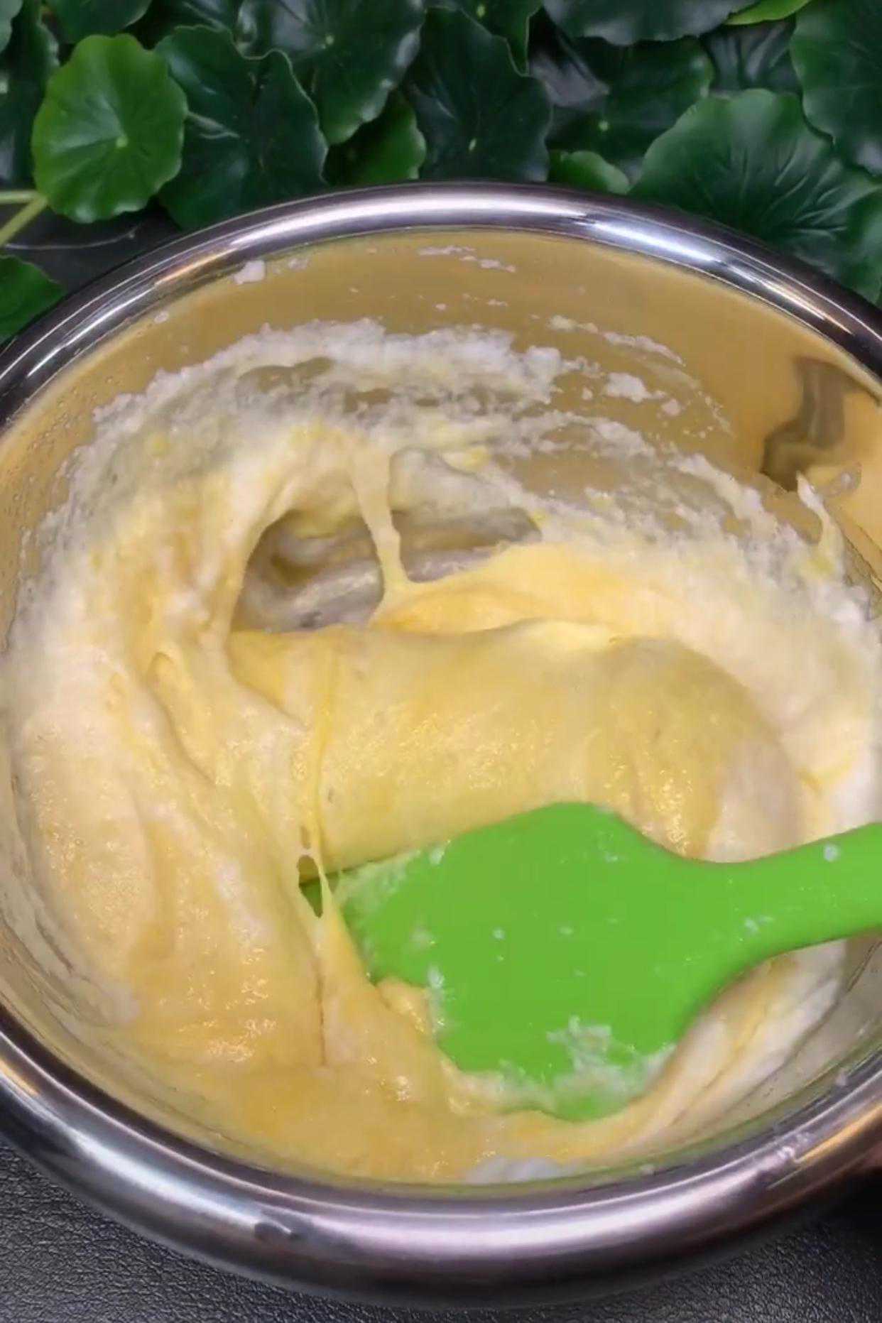 5、打好的蛋清分三次加入到蛋黄糊中,上下翻拌均匀。
