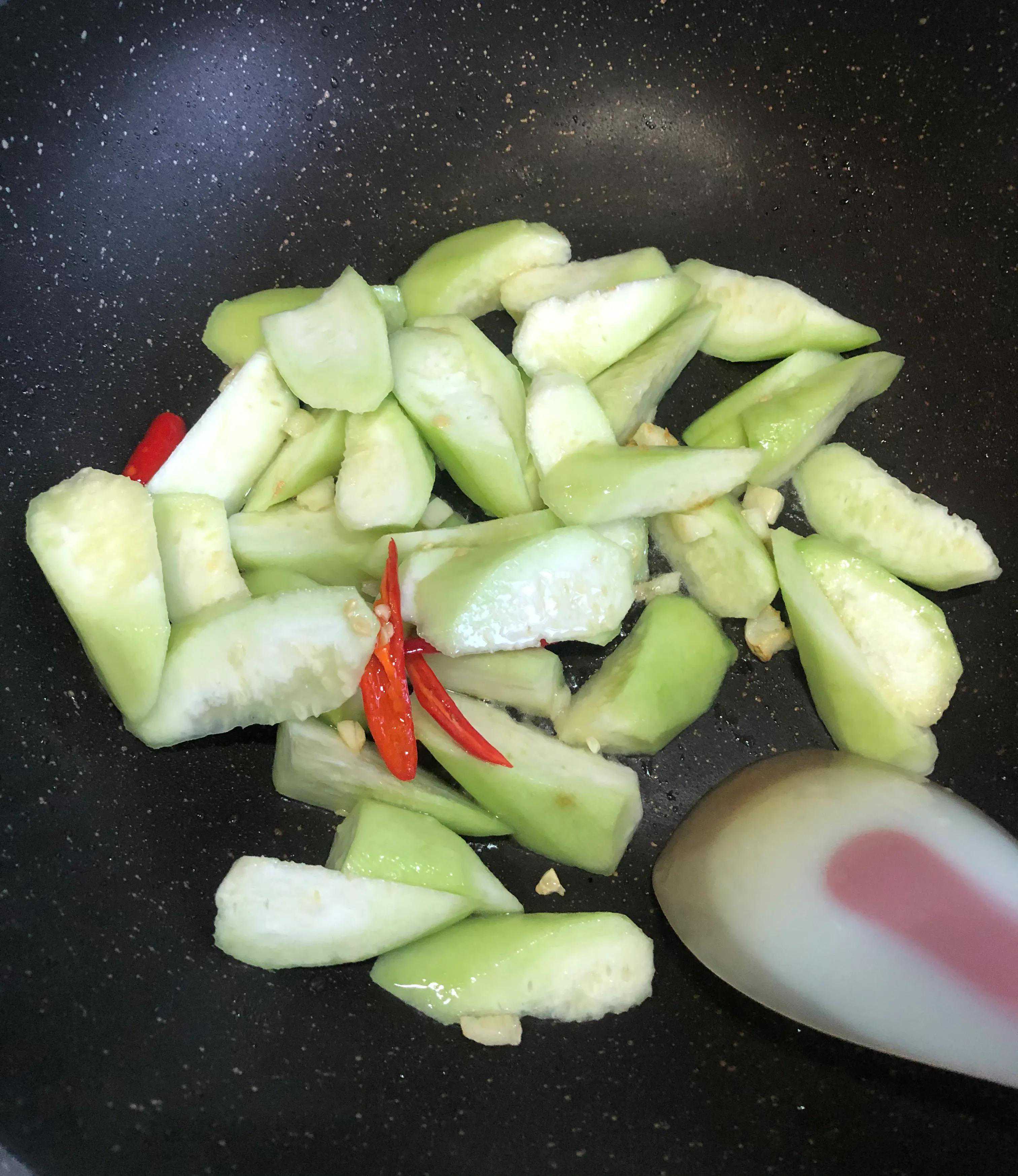 2:锅中喷一点色拉油,下入丝瓜翻炒后加水,煮至丝瓜熟透