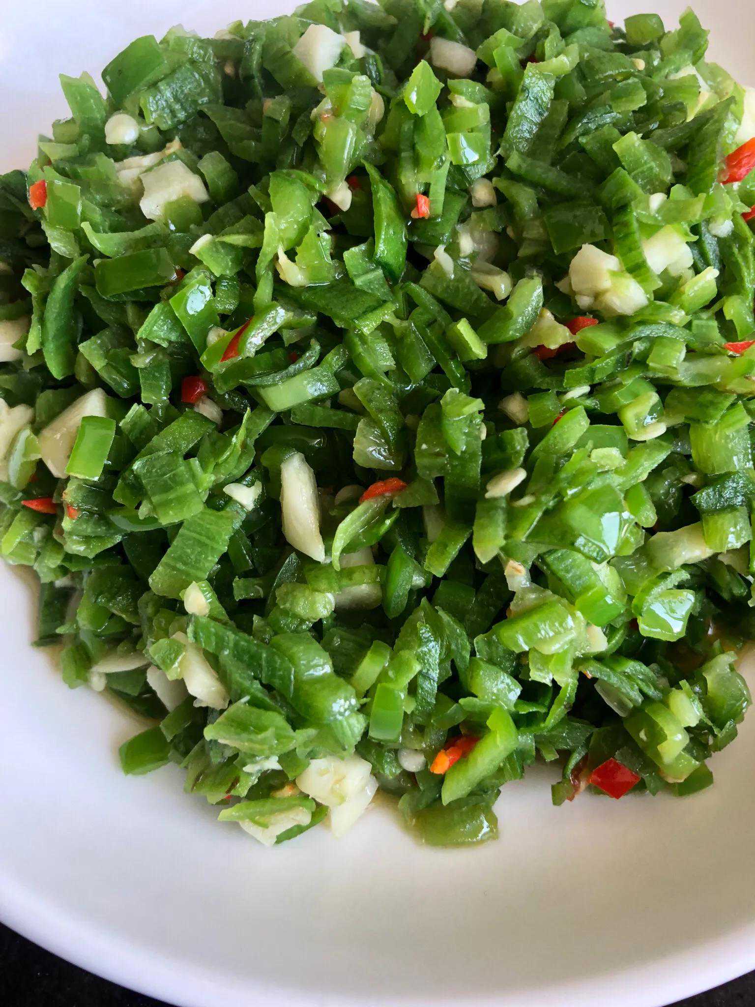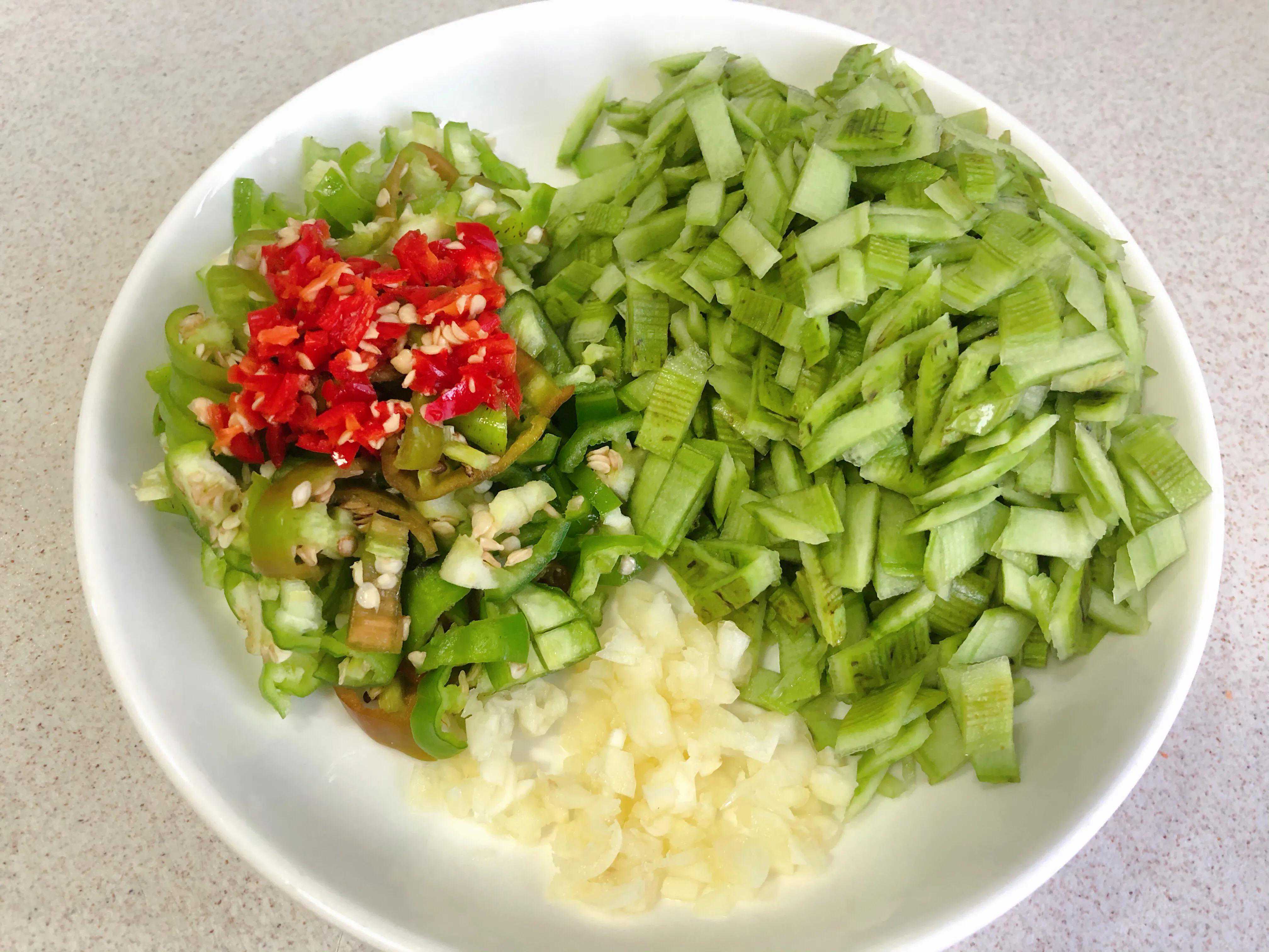 丝瓜皮切碎、辣椒碎、蒜末