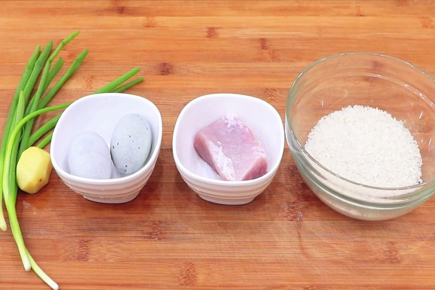 1.适量的大米清洗干净;两个皮蛋切成均匀小块;一块生姜切成姜丝;一小把小葱切成葱花;一块猪瘦肉切成肉丝。