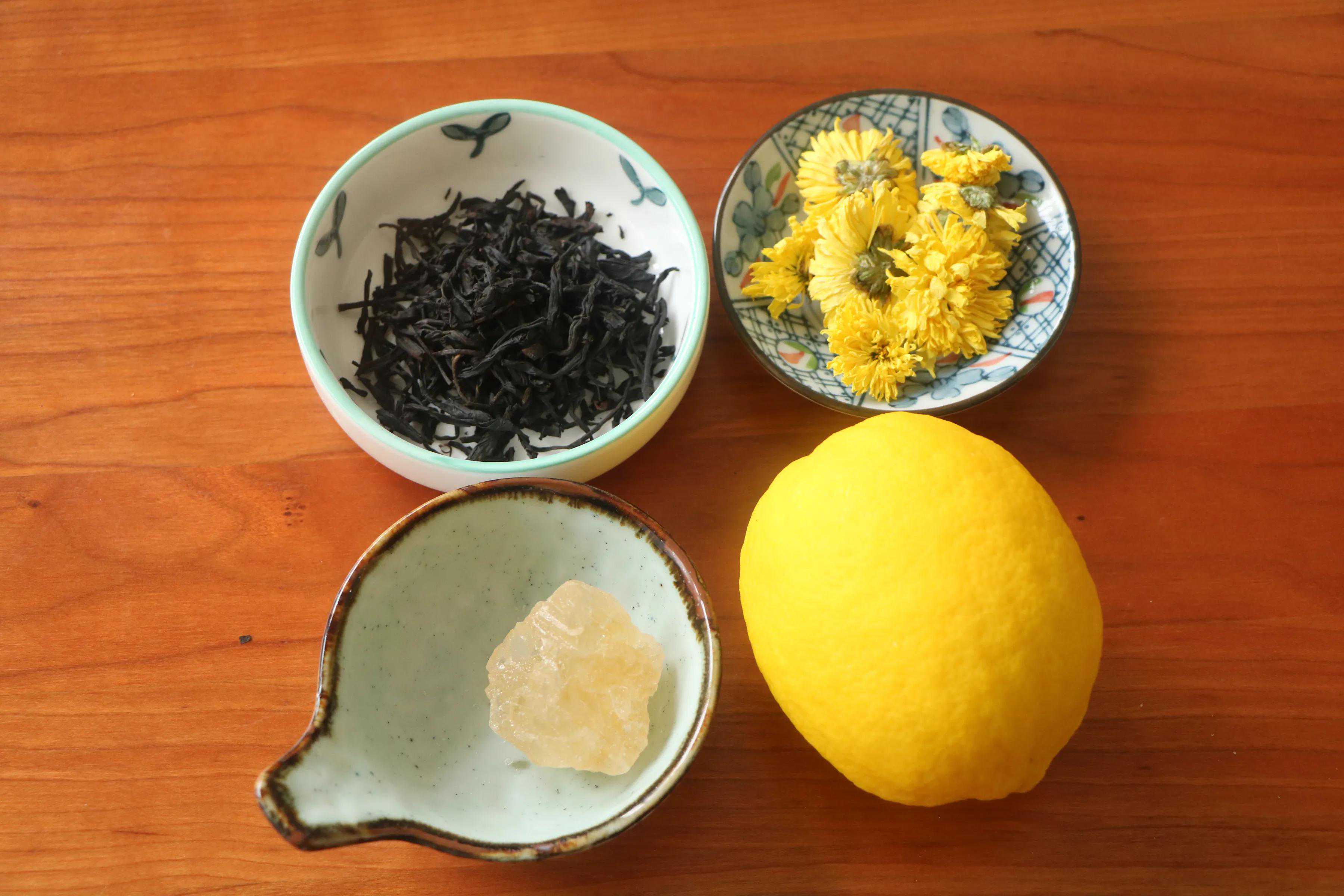 制作配料:红茶5克菊花8朵冰糖1块柠檬半个