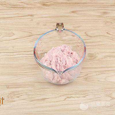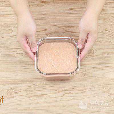 3、将搅拌好的猪肉糜倒入容器