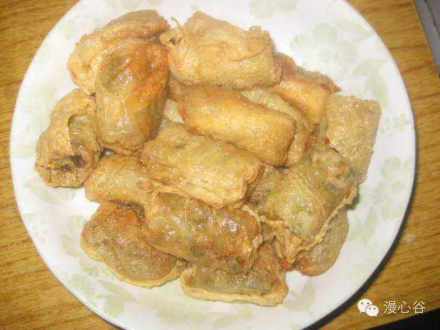 腐卷皮用酿酱卷成圆柱形,腐卷皮接口用糯米粉水粘好,然后用油炸成金黄色。