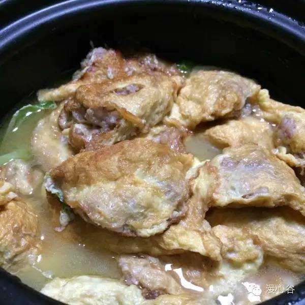 2、猪肉、虾米、冬菇一起捣碎,芋泥和其他配料一起搅拌均匀,酿进油豆腐里面,落油镬中炸一下,再放入豉油燒至熟透即可。