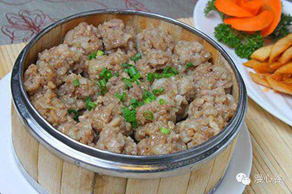 3、炸好的茄片,每两片中间放入肉馅、码在碗内,上笼用旺火蒸分钟,扣在盘内。