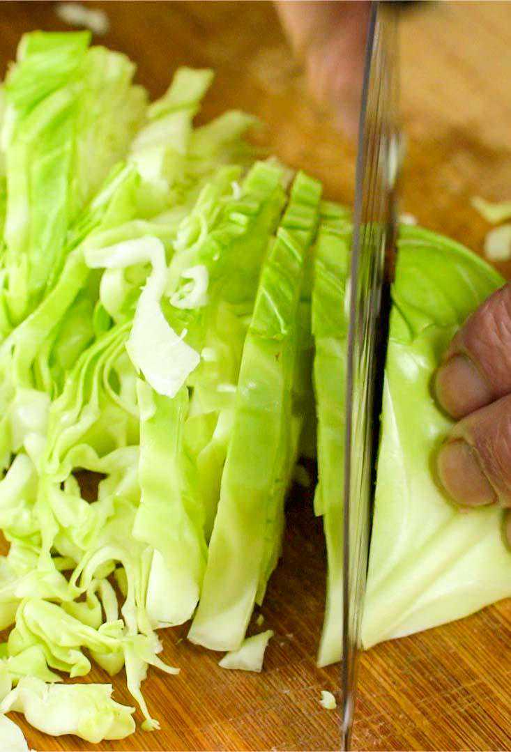 再将清洗干净的卷心菜改刀切丝,如果没有我们也可以用其他蔬菜都可以。