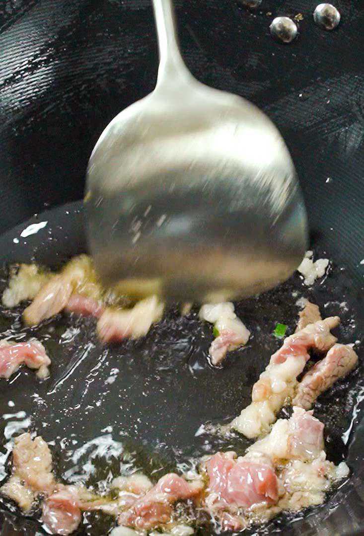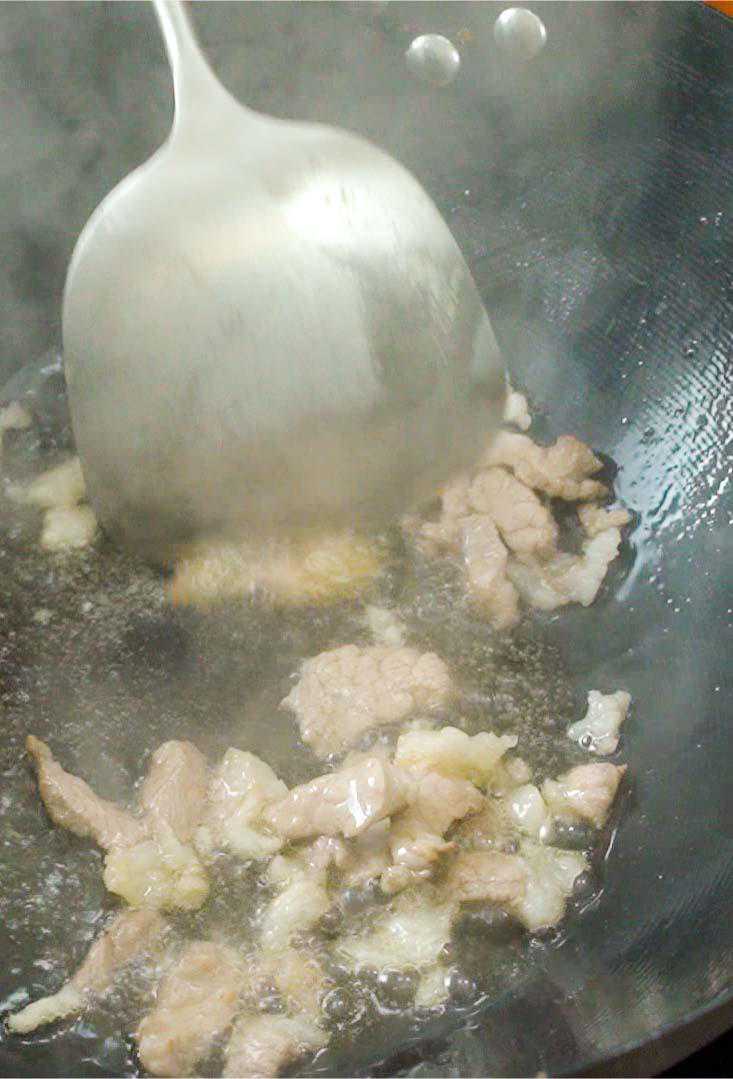 2炒制的顺序自然是先炒肉丝,肉丝怎么炒?炒制到什么程度?这是需要考虑比较多的问题,锅里要有油,油红这是基本条件,当把肉丝放入锅内,会发生噼里啪啦的状态,并且肉丝在变色的过程中会黏锅,此时需要不断地翻炒才能解决该问题。