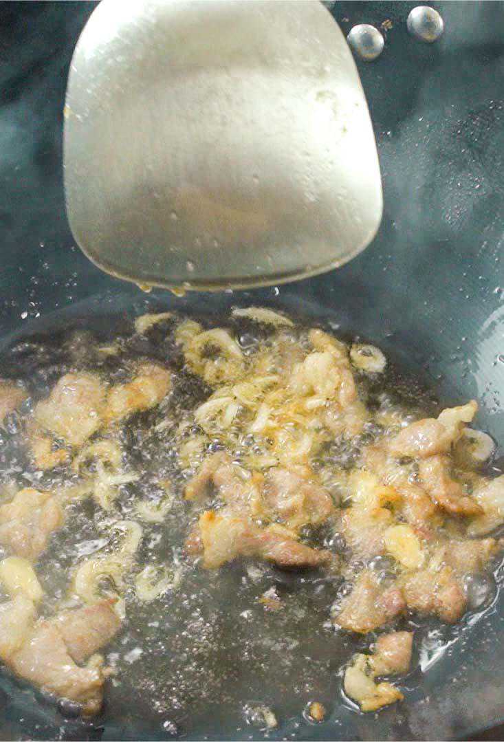 在锅中放入底油,油红后,将切好的肉丝放入锅内,主要就是将猪肉的猪油翻炒将猪肉煸炒出去。