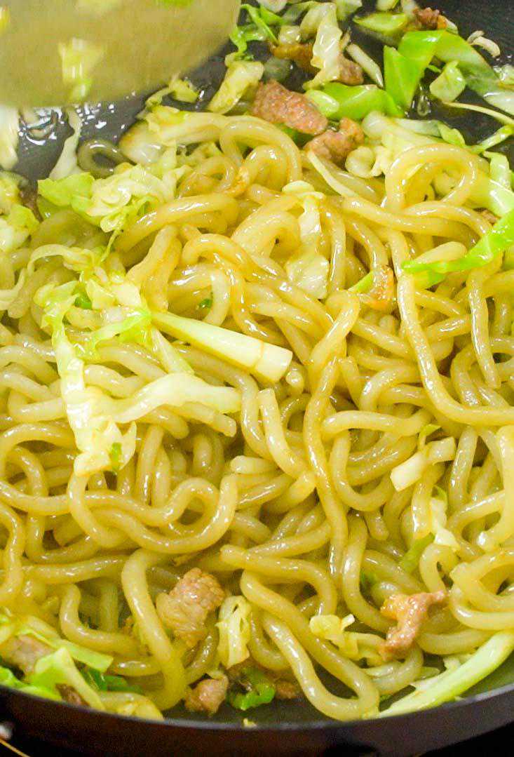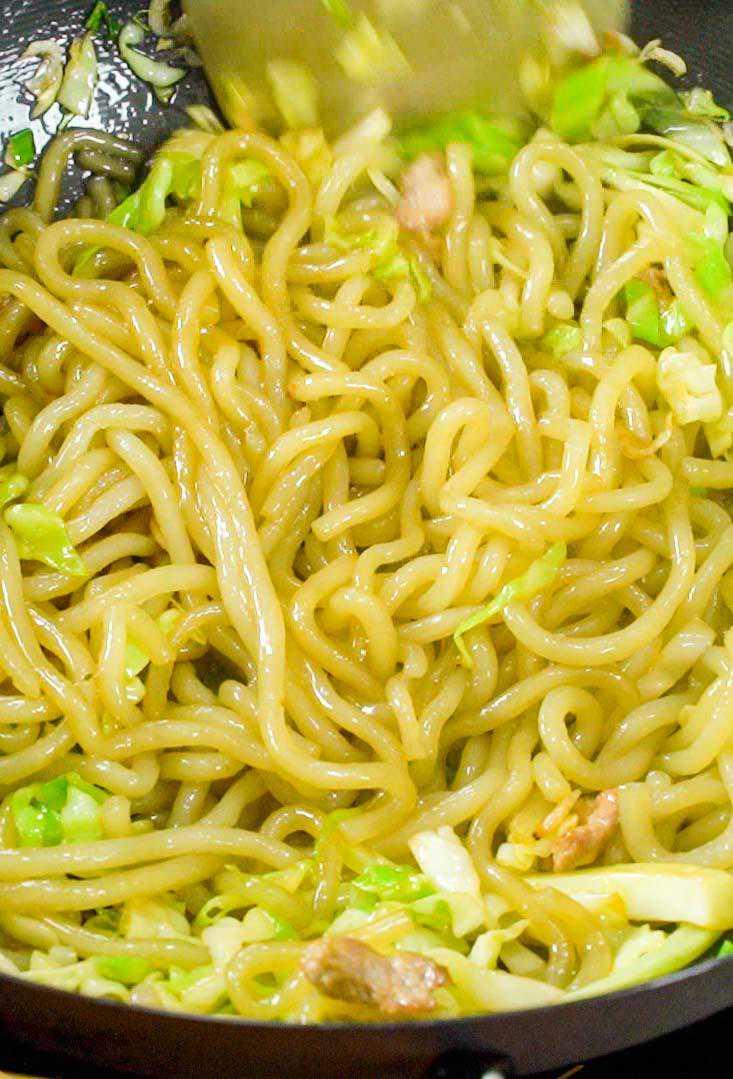 然后再倒入调好的酱汁,紧接着不断地翻炒,不能粘锅要快速翻炒。