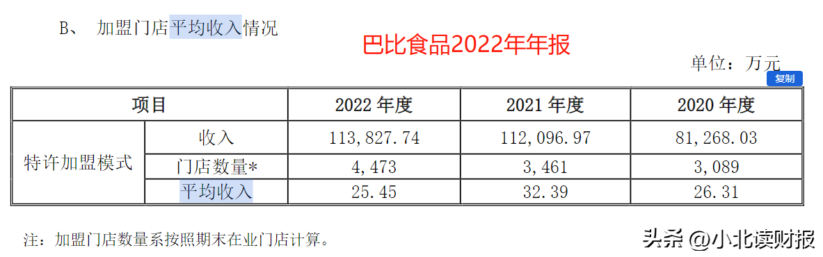 去年巴比食品加盟店的年平均收入为25.45万元,比2021年下降了很多。巴比食品这种收入增长模式是否能成立,还需要时间去验证。比起每年新增多少家加盟商,门店留存量、单店盈利能力对我们更有参考价值。
