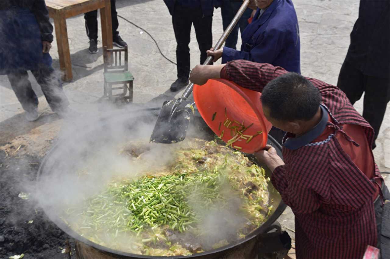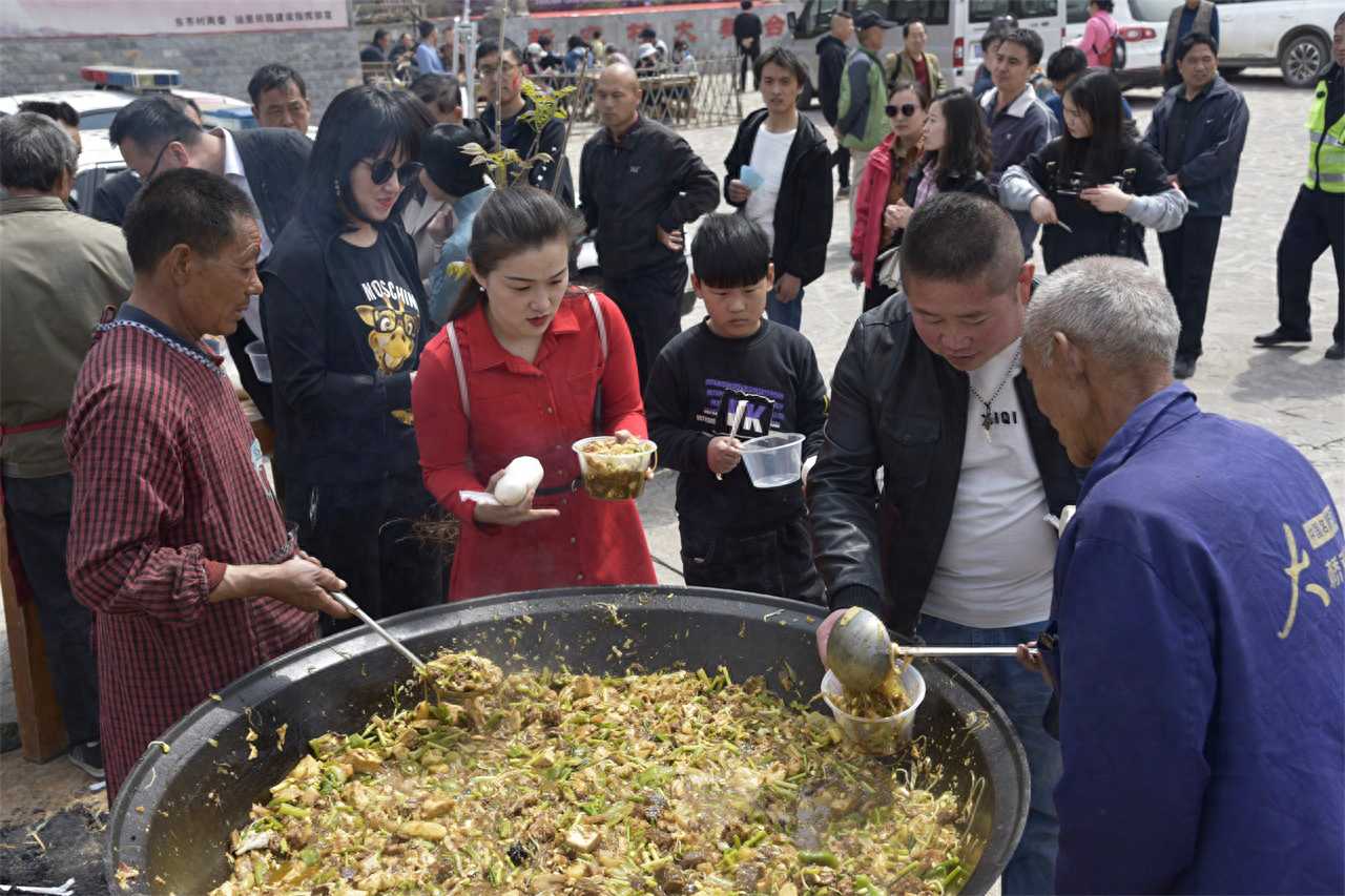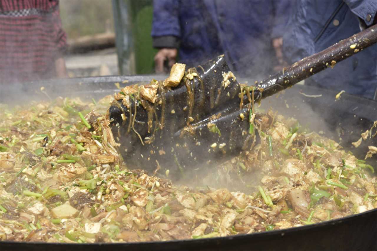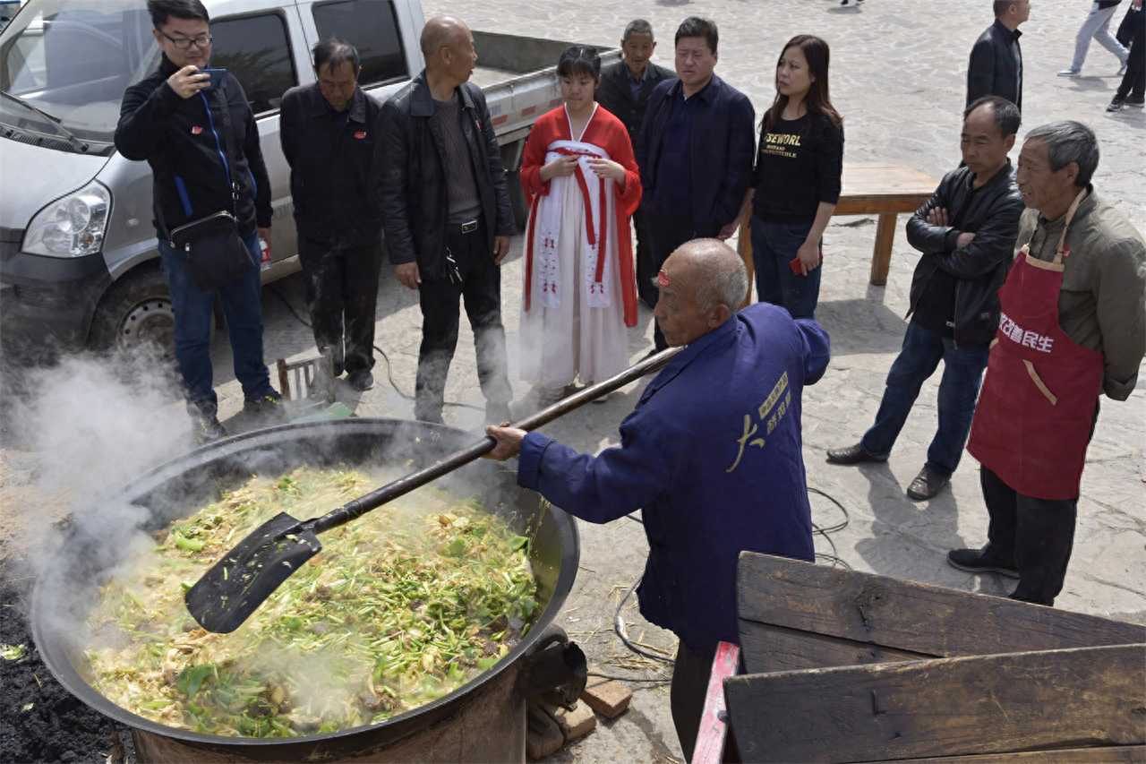 阳春四月,在河南鹤壁市太行山区王家辿村,一位乡村老厨师正拿着铁锹在一口大锅里翻菜,原来这里正在举办庆祝香椿采摘的活动,这锅大烩菜就是为了招待前来参加活动的一两百名游客。