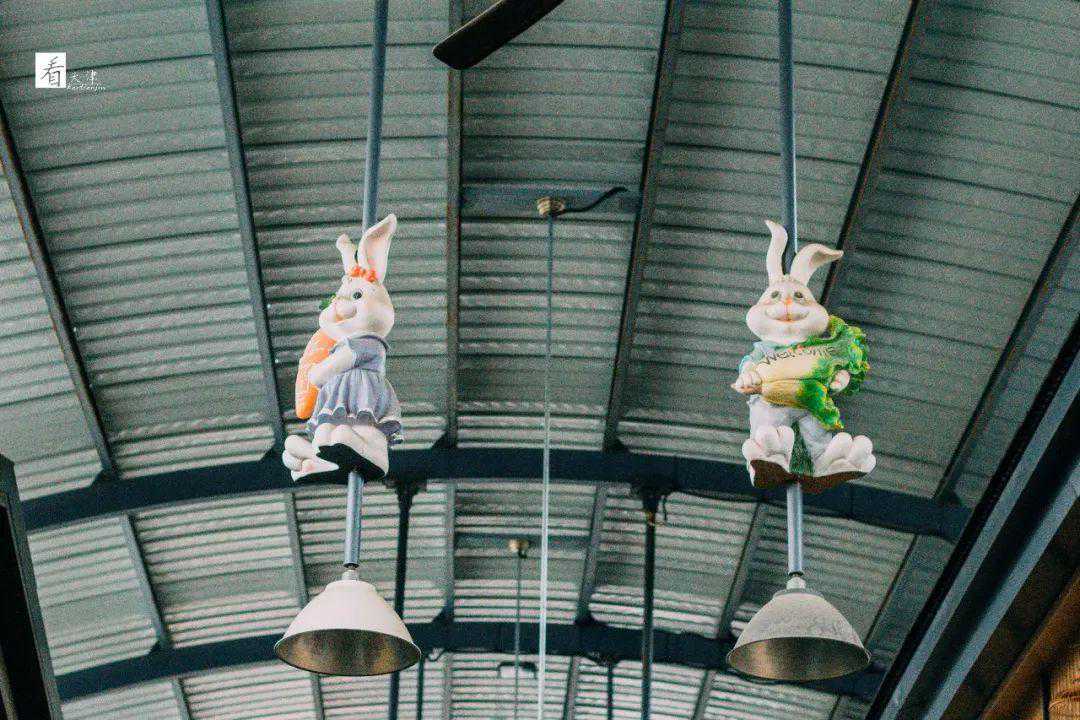 吊顶上是,复古的风扇,还有抱着蔬菜可爱的兔子灯。这看似有点不搭调的风格,却让人格外的惊喜。