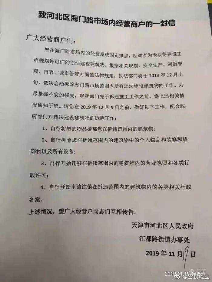 在微博找到了一张官方的通知信,原因给出是:违法建设建筑物。12月5日之前,这些商贩们要退出市场。