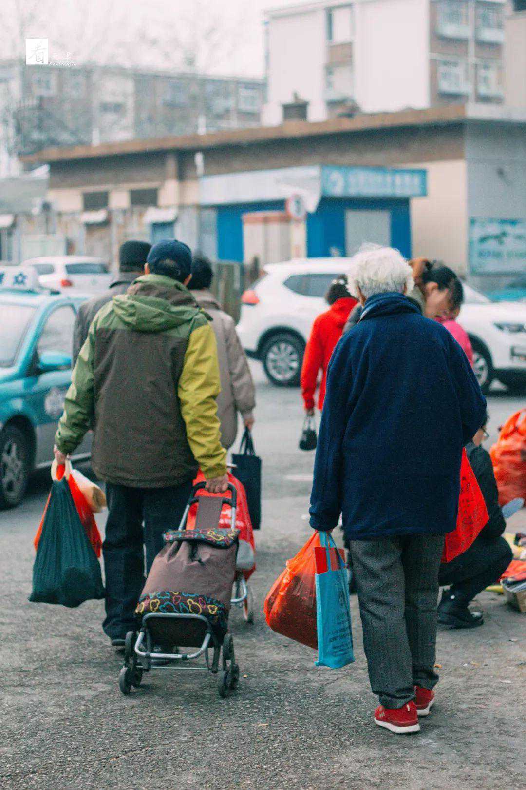 正值工作时间,这里的顾客以退休的爷爷奶奶居多,手背后拉着个小车,这个摊子前逛逛,那个摊子前挑一挑。