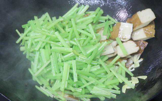 第四步:锅烧热,加入油,下入姜蒜片爆香,再倒入香干,继续煸炒。然后把芹菜段也倒进来,调味适量的盐、鸡精、白糖,翻炒均匀