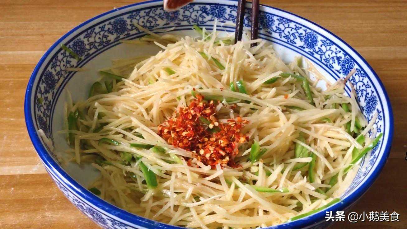 3、饧面的同时,来准备馅料。土豆擦成细丝,加2根青椒切成丝,加少许食用油搅拌均匀,可以形成一层油膜,隔绝盐分,减少出水。再加入盐、鸡精、花椒粉、小磨香油、辣椒粉进行调味。