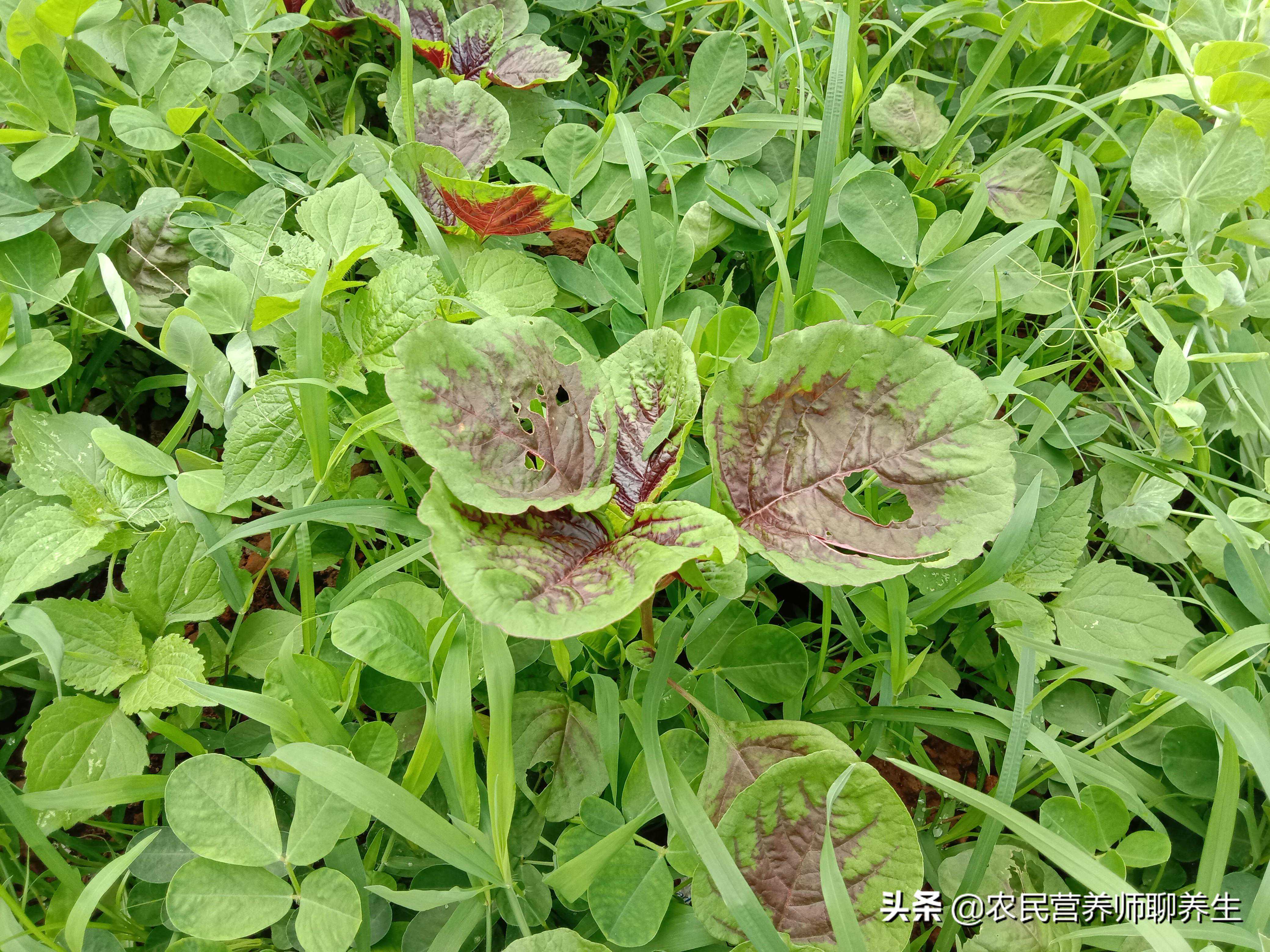 苋菜是我国原产蔬菜,叶片呈卵形或棱形,菜叶有绿色,紫红色和彩绿色,大家看这一棵就是紫红色