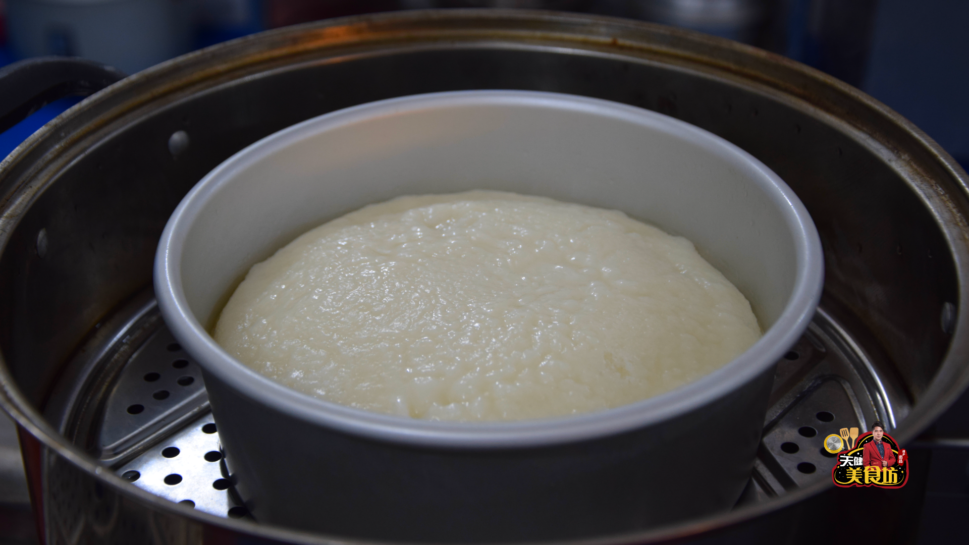 第四步:等米糊发酵好之后,准备一个8寸的蛋糕模具,然后将米糊转移到模具里面,再提起模具稍微地震动几下,将米糊里面的起泡震出来。