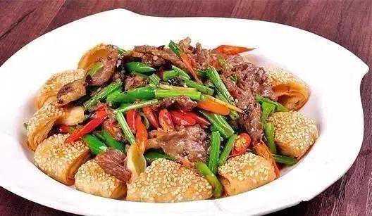 这是把安康名小吃“炕炕馍”与炒牛肉组合成菜,因为炒好的牛肉汁水较多(为使炕炕馍蘸食起来更有味),所以菜名当中用的是“烧牛肉”。