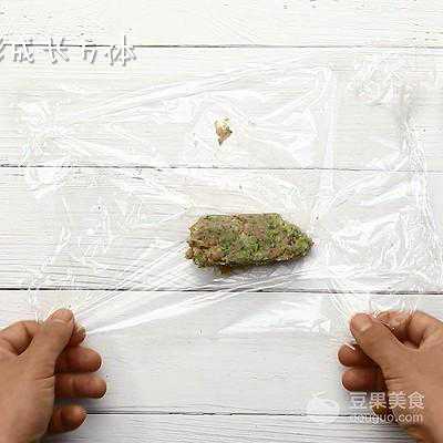 12、将搅拌好的肉糜放入保鲜膜中,包裹整形成长方体。