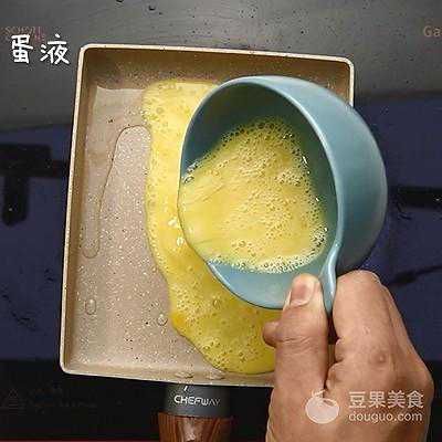 17、最后倒入剩余蛋液,继续用小火煎,再卷一次,即可出锅装盘。