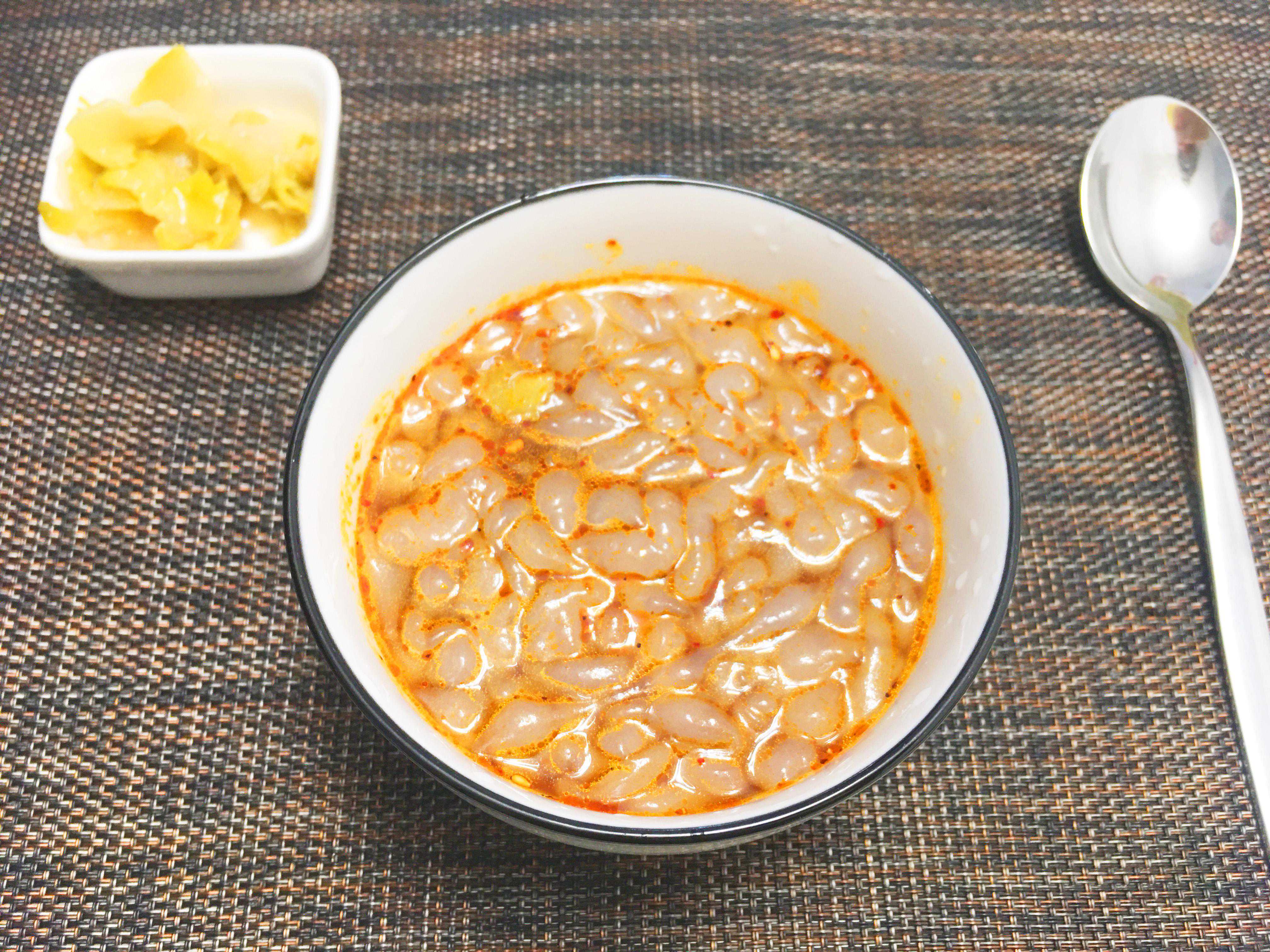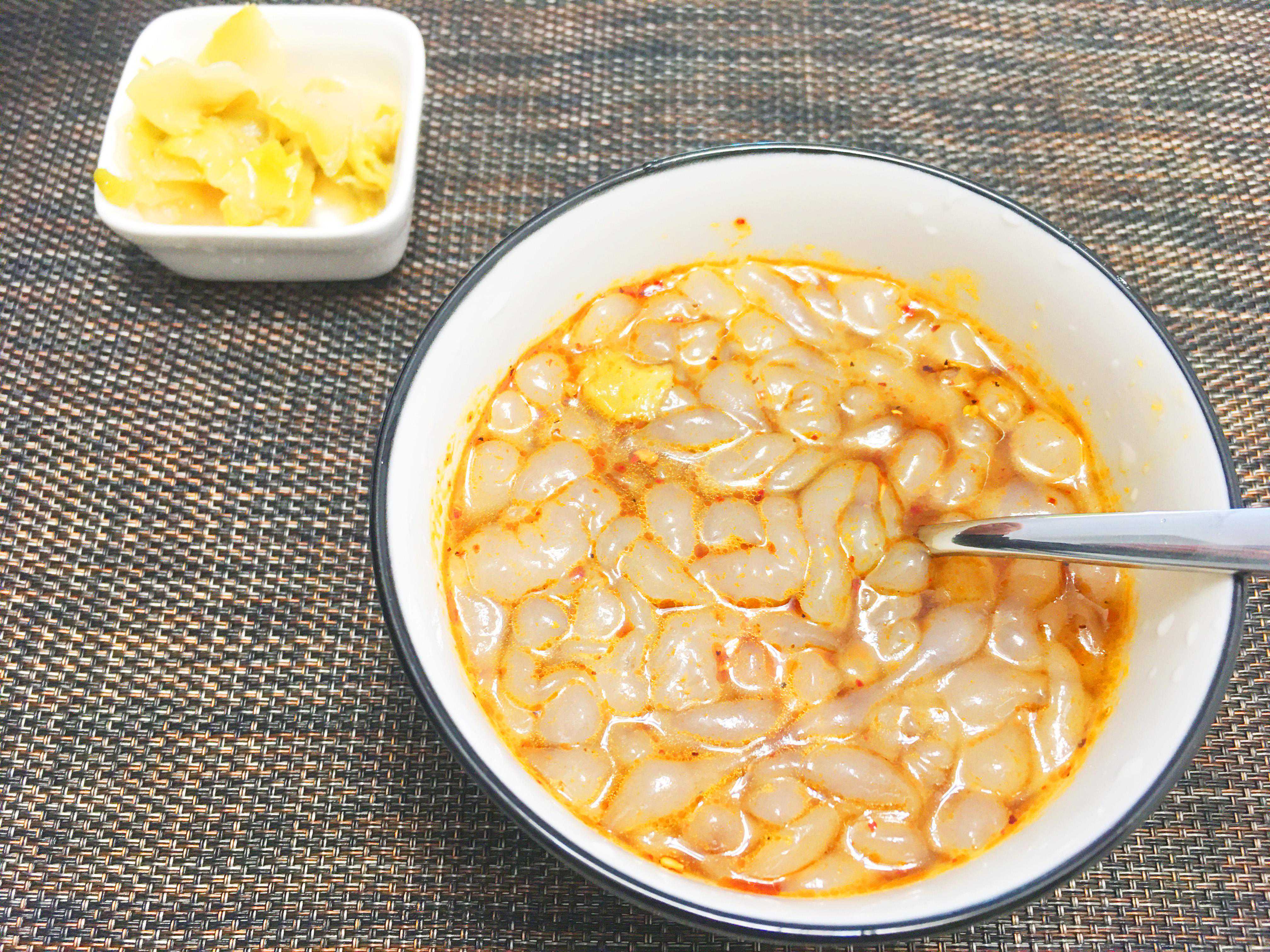吃起来不像吃凉皮,冷到有点感觉胃里凉凉的,这个有点点温热,在冬天吃,再合适不过啦。小时候过年家门口,这个是5毛钱一碗,一年四季都有卖的,通常买上一碗,坐那吃,棚子四处漏风,冻的哆哆的,从来没想过打包回家吃,感觉不是很划算,如果在那吃,基本上我会一点点把桌上的咸菜往碗里夹,搅匀了,和着汤汁一起喝,太好吃了,一点都不觉得咸。是萝卜腌的那种表面有点辣椒粉的咸菜,有点甜甜的。