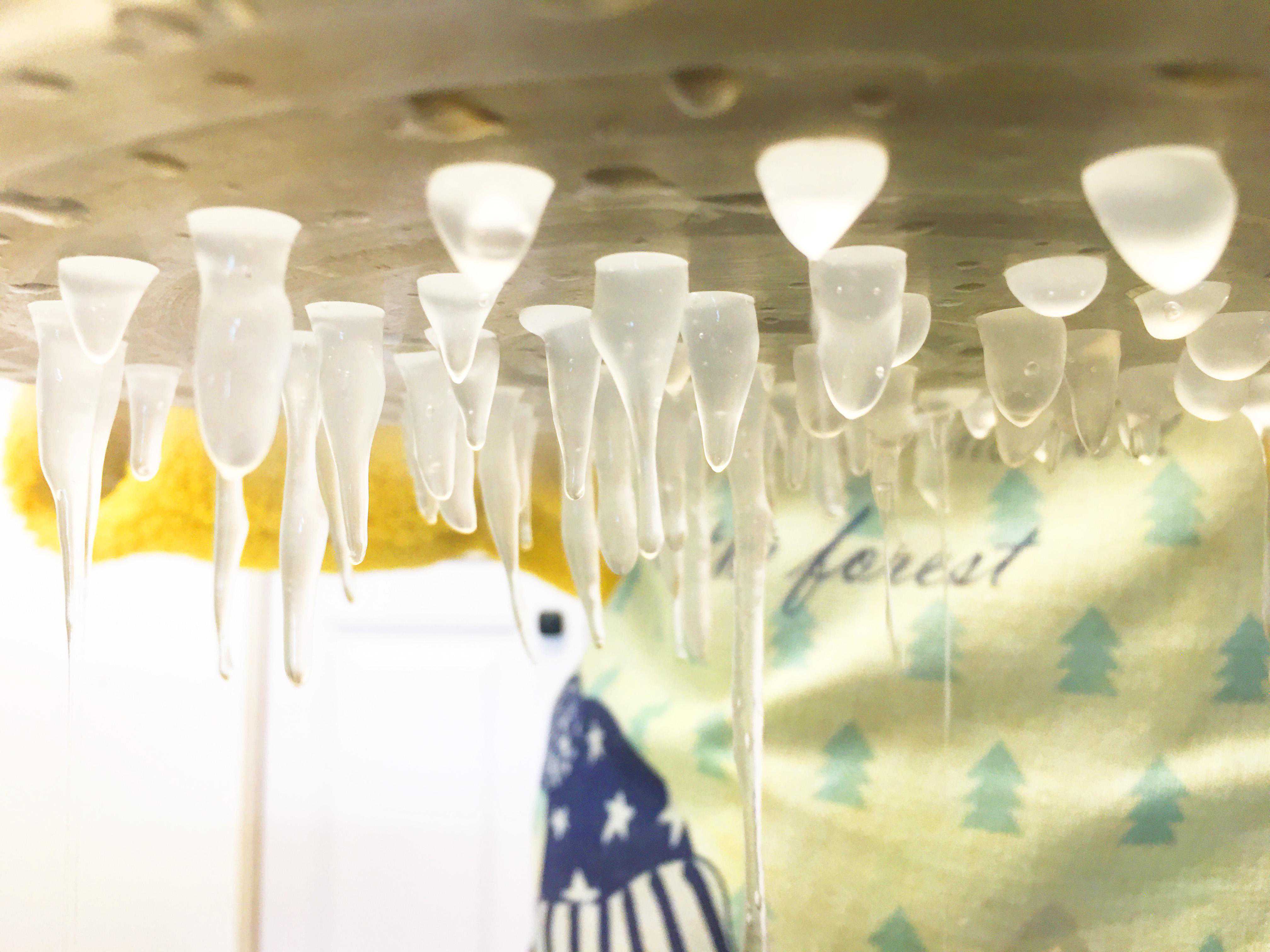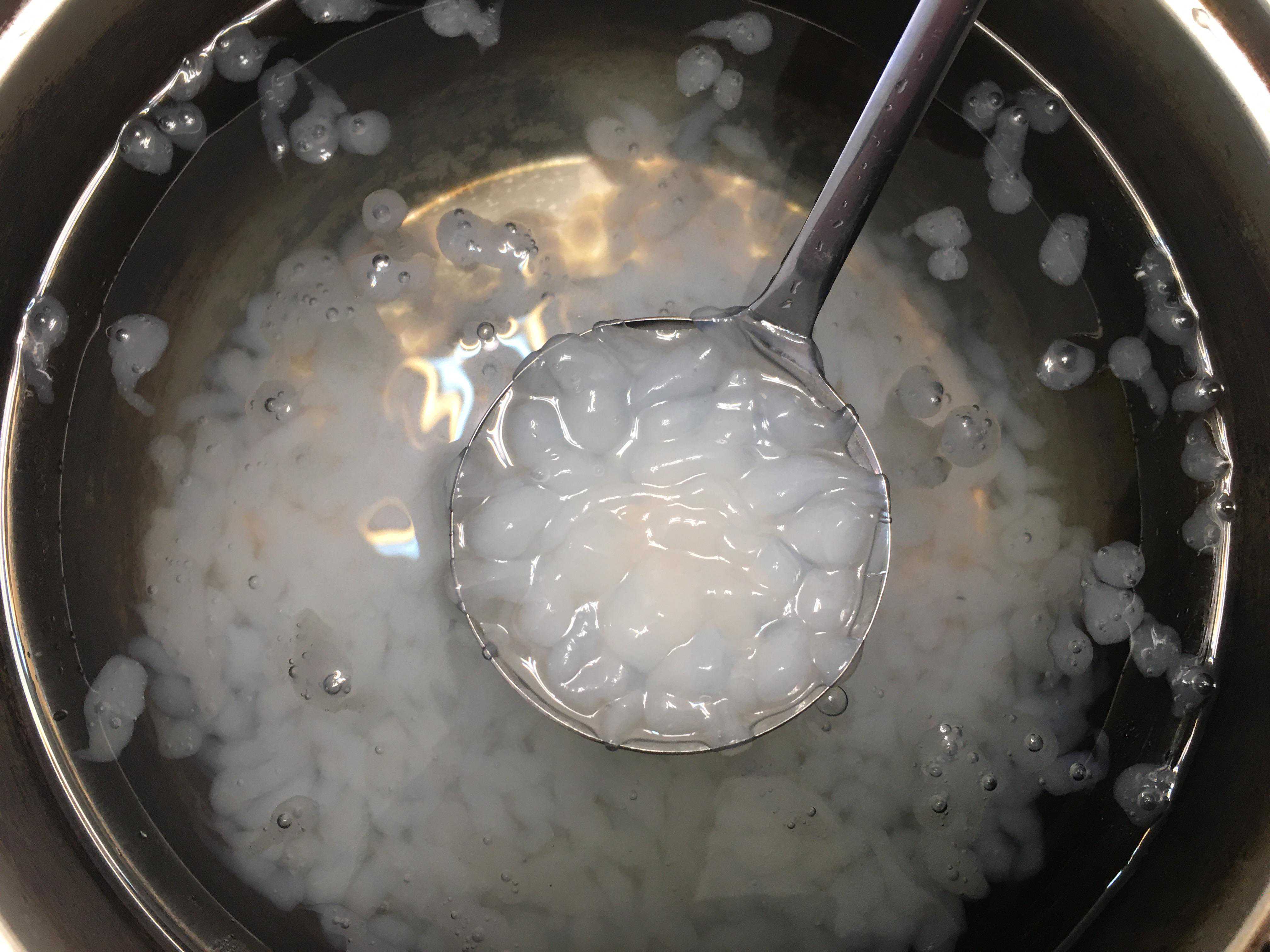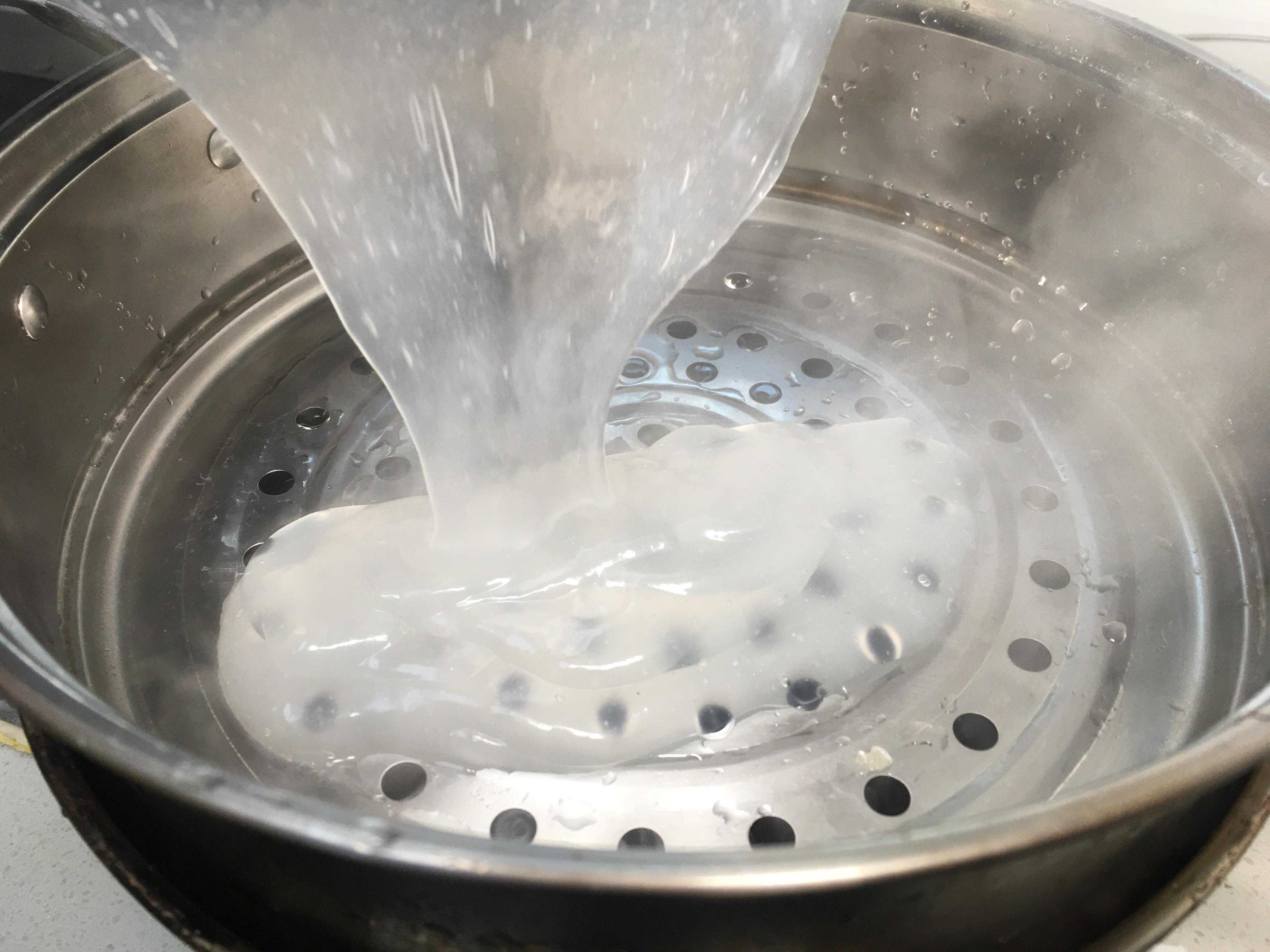 5、蒸屉可以用漏勺代替,盆里装点冷水,一点点倒山芋粉,一样的操作方式。