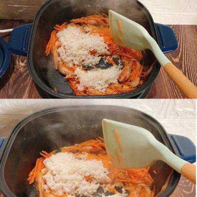 2、煸炒洋葱,虾头炒出红油,煸炒胡萝卜丝