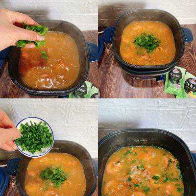 6、煮至大米八分熟下入青菜,出锅前加入葱花