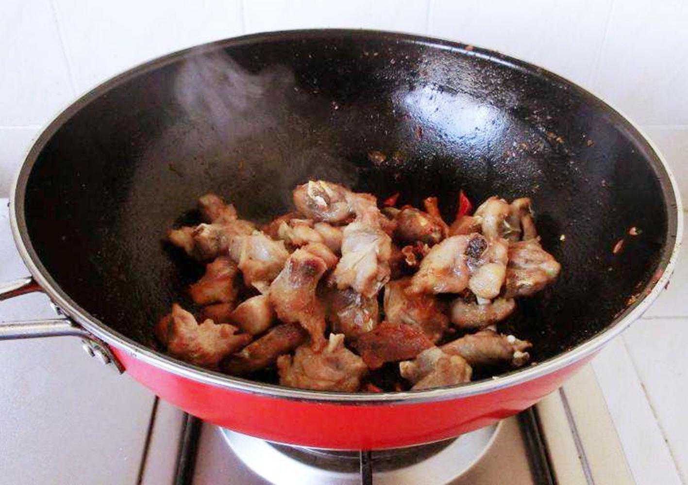 3、等油烧热后,将兔肉放入锅中炸。炸到表面有硬壳的时候,将兔肉从锅中捞出。等到锅中的油温烧到九成热的时候,再次将兔肉放入锅中炸。炸到外壳酥脆后,将兔肉从锅中捞出,沥干油分备用。