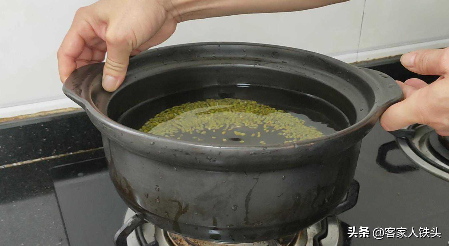 第一步:先把绿豆清洗干净,洗净后倒入砂锅中,加上适量的清水,水在这一步要一次加足,煲汤中途不要加水,会破坏汤中的营养成分,盖上锅盖先用大火把它烧开。煲绿豆汤跟煲绿豆沙不一样,煲绿豆沙我们要先把水煲开了,再来下绿豆,这样绿豆沙的口感更好。