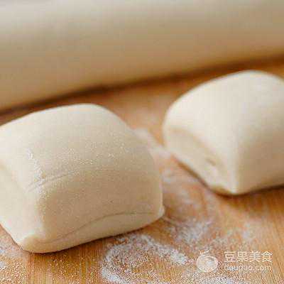 5、将静置好的面团取出,放在撒了面粉的案板上,搓成长条,分成60g每等份的面团。*注:分好的面团用保鲜膜盖上,避免水分流失。