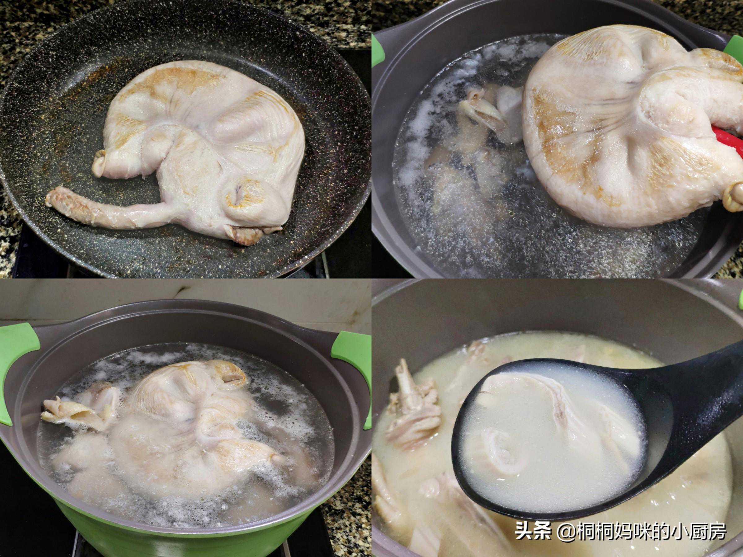 5、一直保持大火煮汤,直到将清澈的汤熬成奶白色后再转小火慢炖1.5小时。