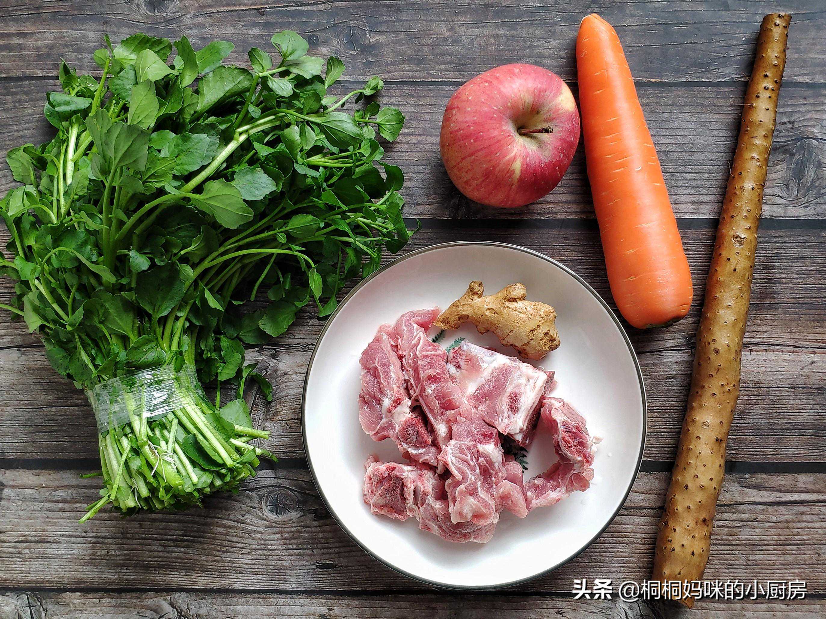 材料:猪骨、姜、淮山适量、胡萝卜1根、苹果1个、西洋菜适量