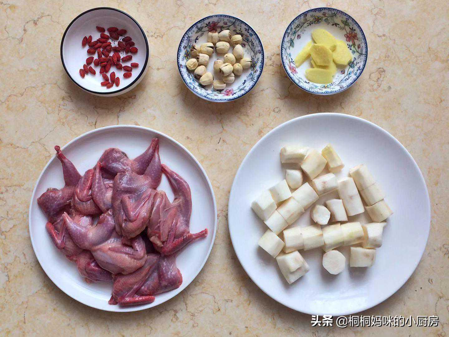 材料:鹌鹑三到四只、淮山1根、莲子1把、姜1小段、枸杞1小把、清水适量、盐适量