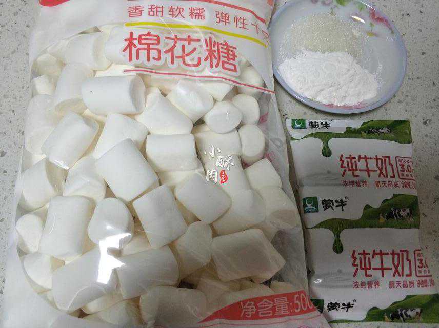 然后准备做雪糕需要的原材料,棉花糖、纯牛奶、白砂糖和玉米淀粉。(如果不喜欢棉花糖的味道可以用淡奶油来代替)