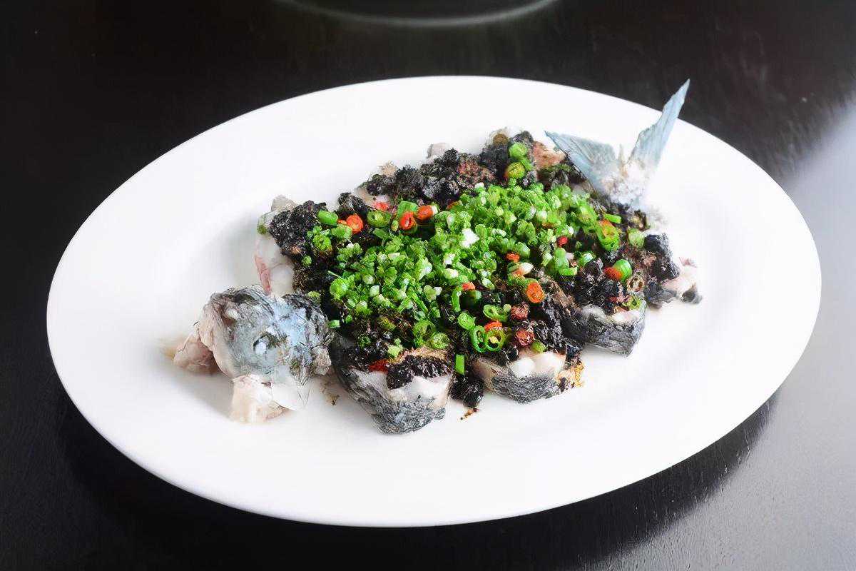 3.把豆豉下入烧热的菜油锅里炒香,起锅盛在盘中鱼身上,再把盘子送入蒸笼蒸至鱼肉熟,取出来撒些葱花和青红小米椒圈,即可。