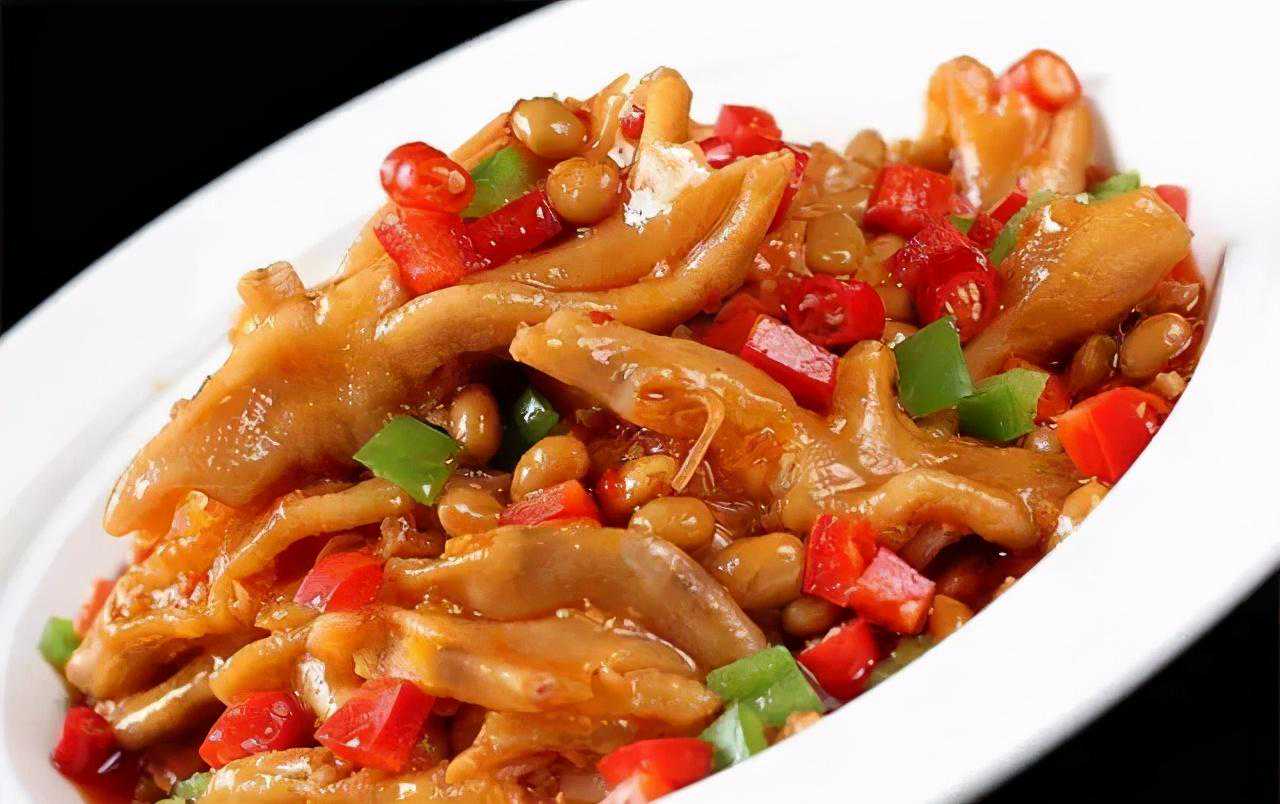 2.锅里放色拉油烧至四成热,下水豆豉先炒香,再放入卤好的去骨鸭掌、青红椒丁和小米椒圈翻炒,其间加美极鲜酱油、鸡精、味精、白糖和鲜露调好味,等淋入泡椒油和花椒油时,出锅装盘便好。