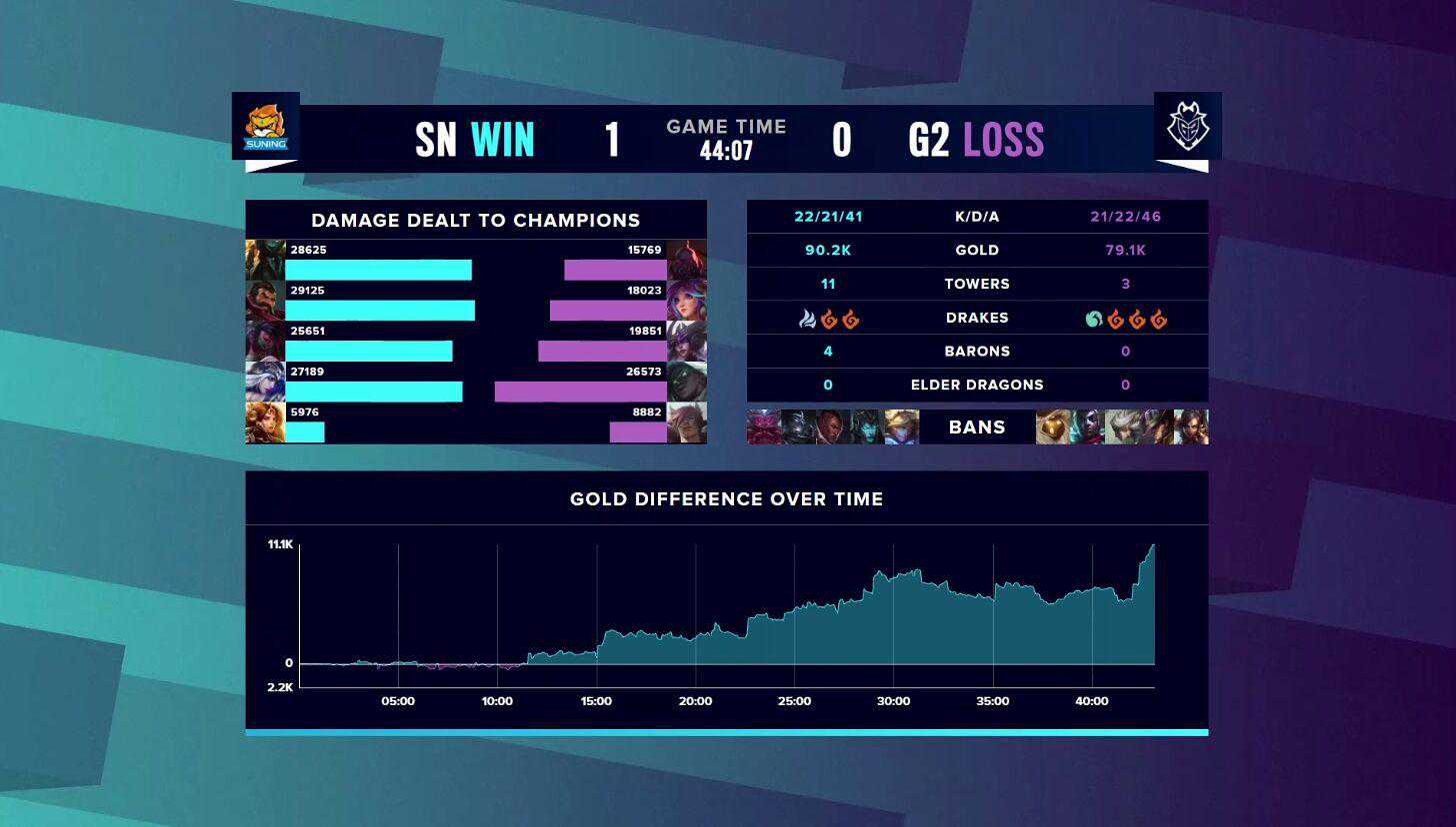 G2利用手长优势窝在基地不出门,而此时SN做出了一个灵性决定,打大龙,让G2出门打火龙魂而后逼团,最后一波中,阿斌的船长TP完美绕后,直接爆炸桶一打二瞬秒G2双C,带领SN直接一波结束比赛,整体来说,SN的整体决策以及个人选手实力在本场比赛都要比G2表现的更加出色,最终才取得胜利!