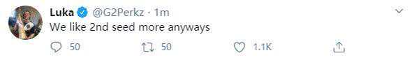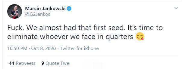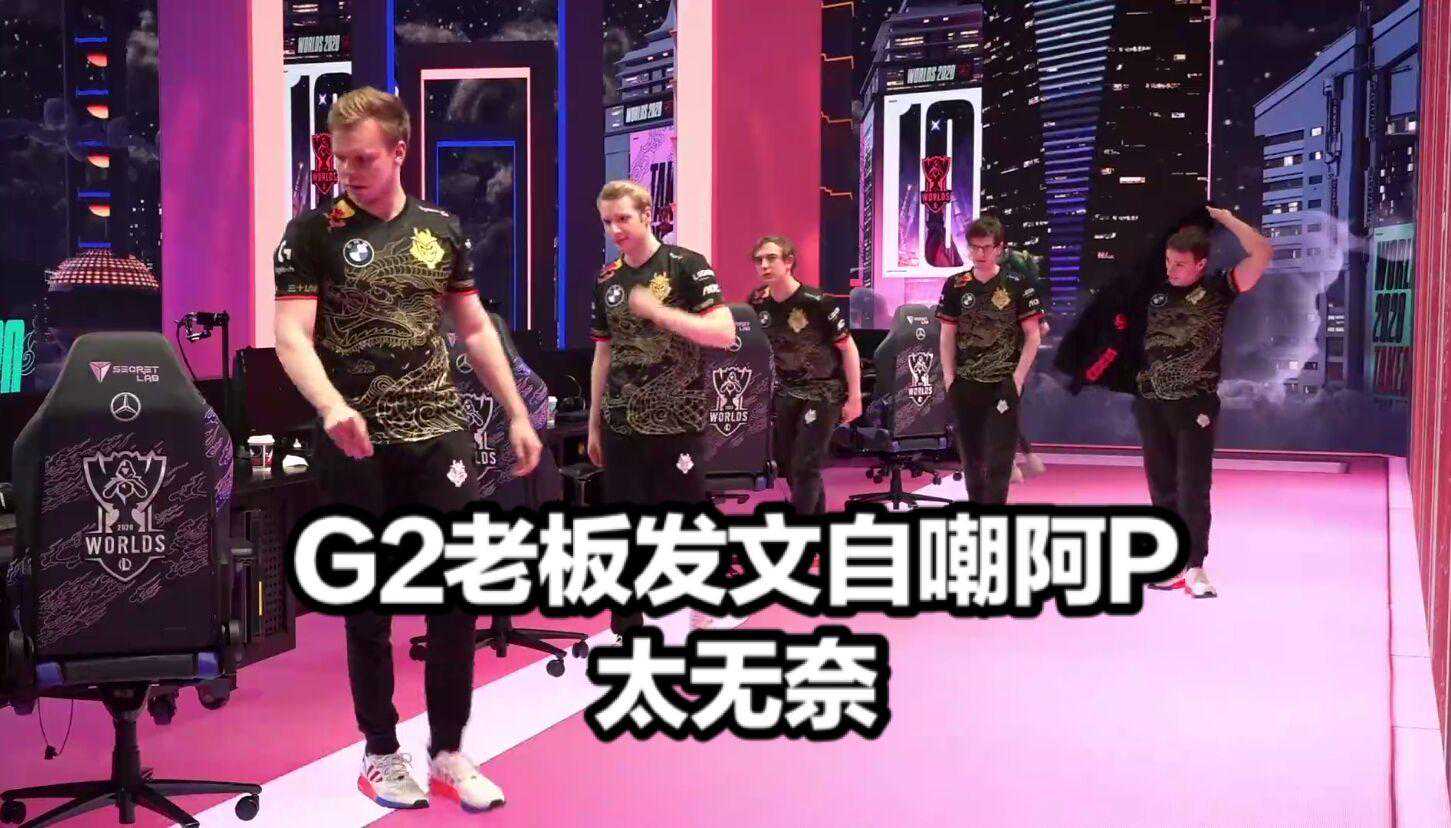 赛后阿P与辅助也是发文说到:“反正我更喜欢当二号种子!”太真实了,可以想象阿P当时肯定特别无奈,G2打野Jankos则是气得爆粗口说到:“淦!我们差点就拿到一号种子了。是时候干掉我们接下来在八强赛所面对的敌人了!”这波豪言壮志还是值得赞赏,而G2老板则是的说到:“好消息在于我们有了另一个可以用来玩自己梗的gif图,谁来上一个火药桶的图!”G2老板还是不忘自嘲整活啊,但总感觉是因为绝望才自嘲!
