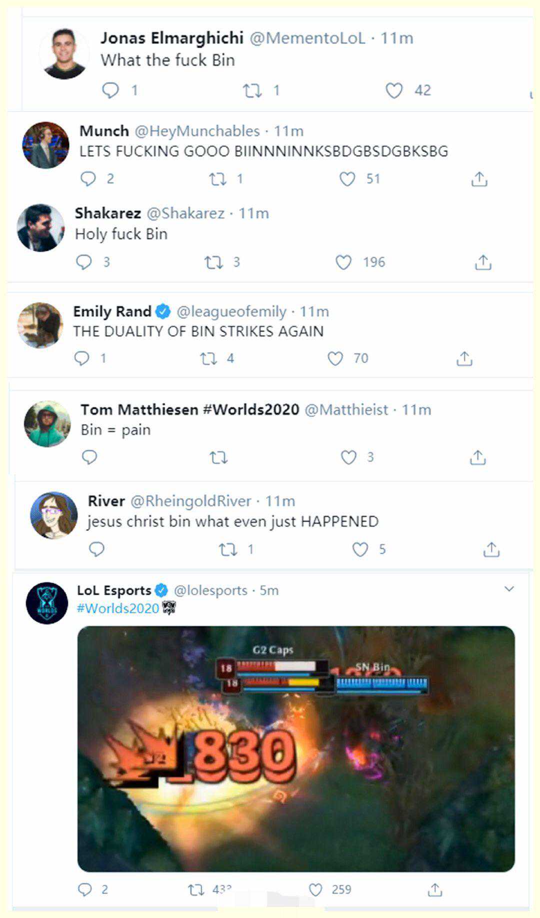 许多欧美解说纷纷发文看傻了,不敢相信的表示阿斌这是什么操作?更有欧美解说直接爆粗口表示阿斌太强了,神一样的存在!而LCS赛区的战队C9更是搜集了G2历届比赛的图说到:“G2这就是天启四骑士!”其中就有Theshy的剑魔天神下凡,小天盲僧一串二以及本场阿斌船长的瞬秒双C图,C9这波嘲讽太到位了,G2看到估计扎心了!