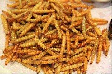 竹虫又名竹蜂、竹蛆,广宁人把它称之为"笋蛆"。它啃吃幼嫩竹笋吸收养分,20天内从米粒大小长到手指头般粗大,寄生在竹筒内,从竹尖逐节往下吃,最后藏于根部,体肥停食,准备破蛹而出。竹虫富含高蛋白、氨基酸。将竹虫入盆,翻拣干净,用70℃的热水将其烫死,晾干水份。2,锅上火注入菜籽油,烧至三成热时放入竹虫炸3分钟,呈深黄色发出响声时,捞出装盘,撒上椒盐即可。这一个我是真的吃不下去。不知道重口味的你怎么样?