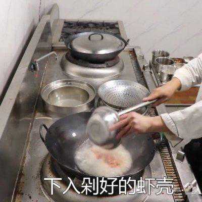 6、锅热烧油,油温四成热时,下入剁好的虾壳,小火熬虾油。