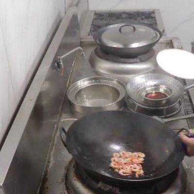 8、锅热下入2小勺虾油,并下入北极虾仁,小火翻炒至虾肉微卷后出锅待用。
