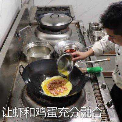 10、在锅边淋一丢丢虾油,将剩余的蛋液倒在虾肉与鸡蛋之间,让虾与鸡蛋充分融合,也可防止虾肉从鸡蛋上掉落。