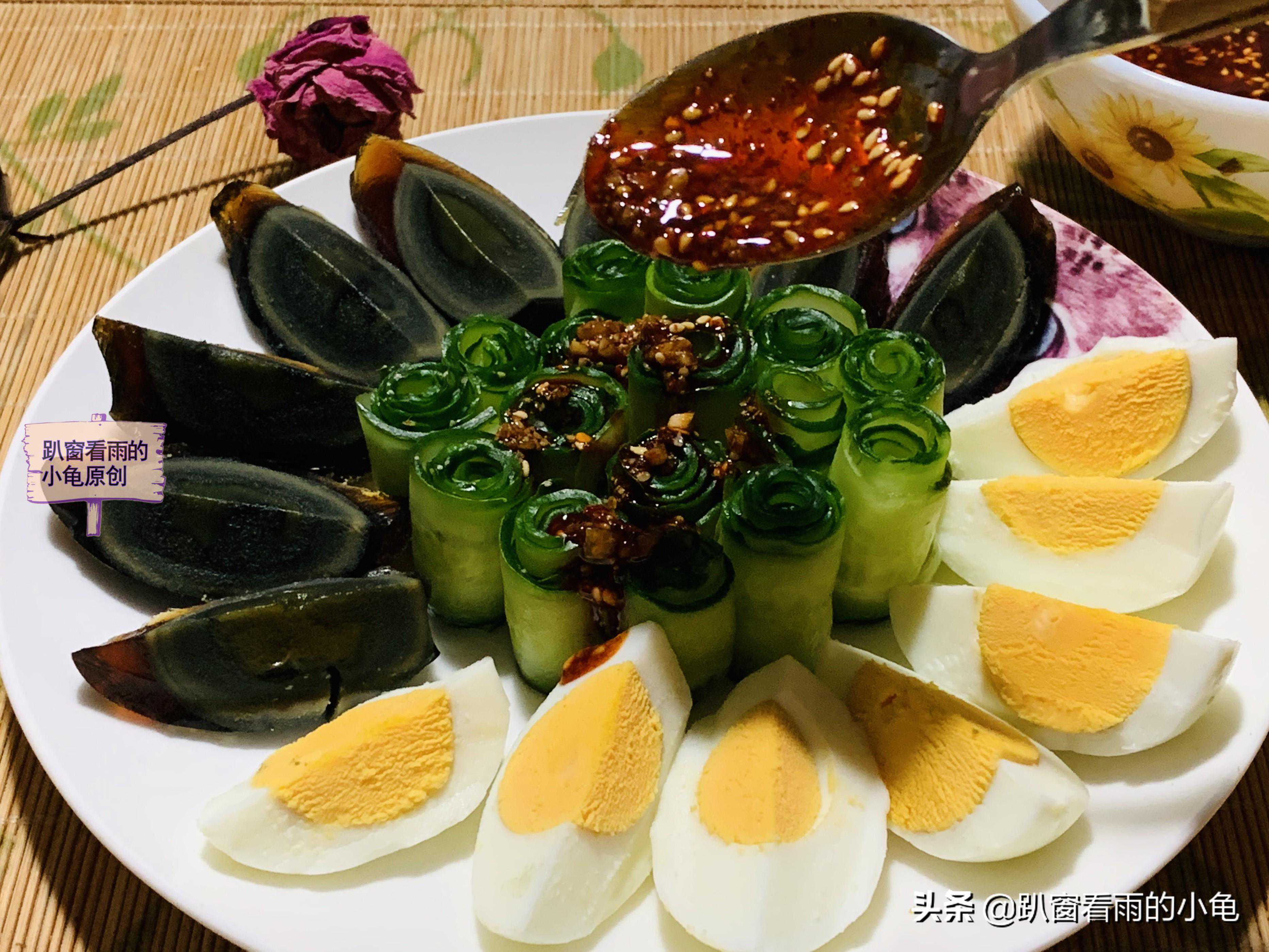 做完黄瓜筒,现在我们开始摆鸡蛋和松花蛋。