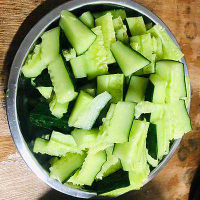 1、黄瓜挑那种比较胖的,胖的均匀一点的,头和尾巴不用瘦瘦的那种,洗净然后一整条放在案板上拍它,拍完切块