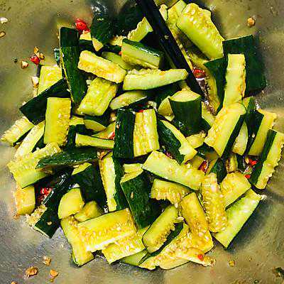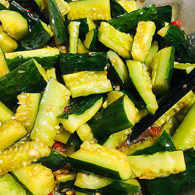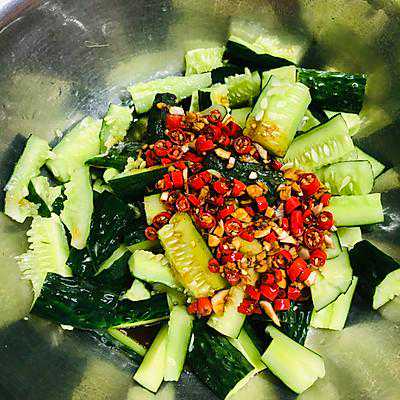 简介ByY。~用料青瓜两条生抽两勺陈醋六勺蚝油10克盐2克大蒜5瓣小红椒10个做法步骤1、黄瓜挑那种比较胖的,胖的均匀一点的,头和尾巴不用瘦瘦的那种,洗净然后一整条放在案板上拍它,拍完切块2、准备调料,然后加两勺生抽,醋6勺左右,依个人口味加3、热油,油适量,加一点花椒油一起热,大火热到冒烟,别关火,再...